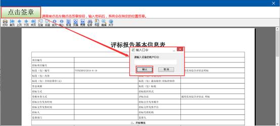 2、在弹出的页面中,检查并核对评标报告内容后,点击“点击签章”按钮并输入密码,点击确定之后,开始下一张评标报告的签章。如下图:
