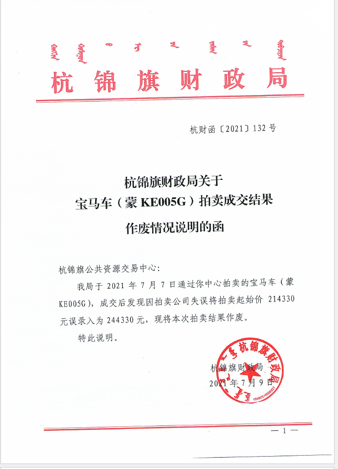 杭锦旗财政局车辆转让网上拍卖成交结果公示