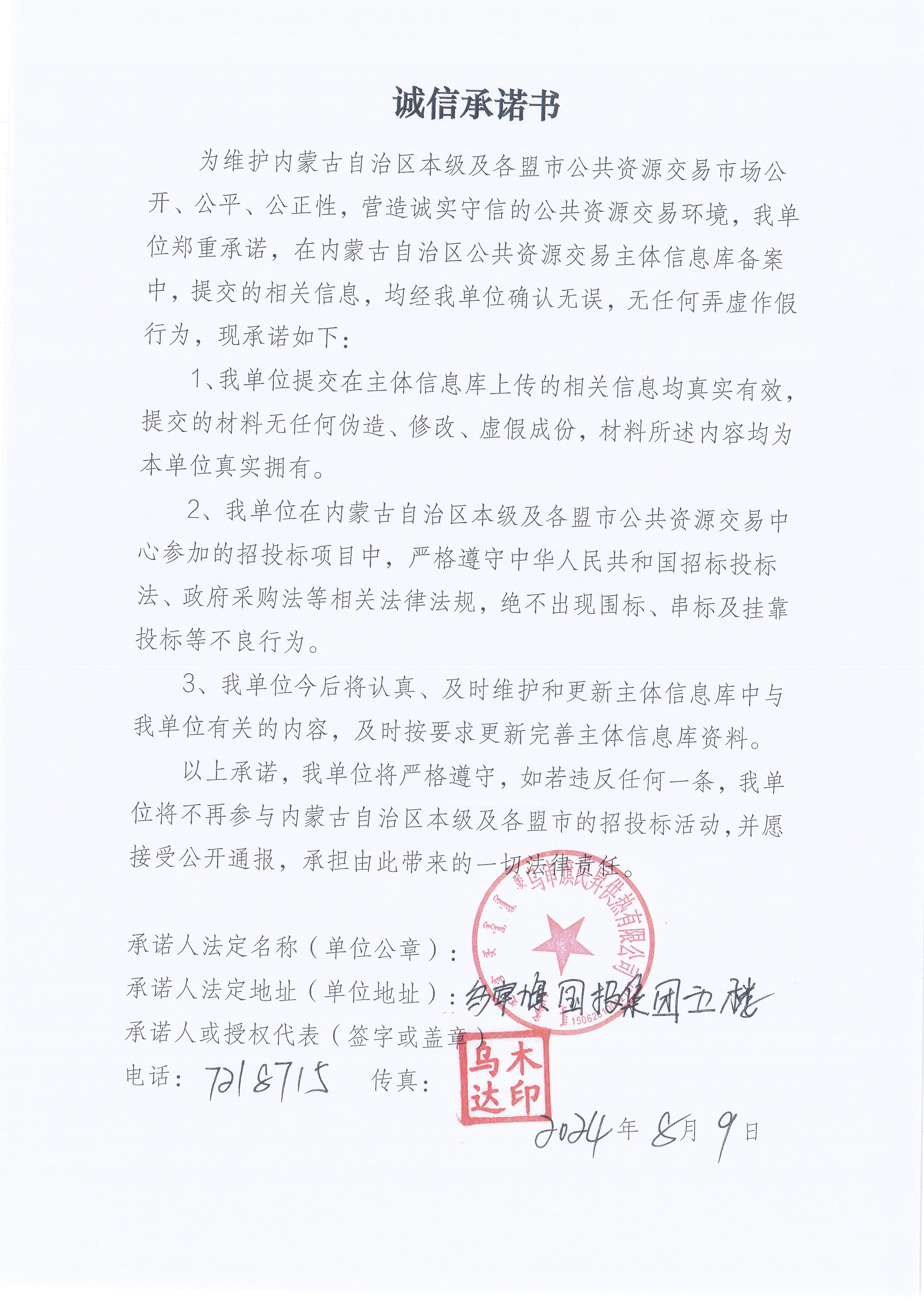 招 标 人(章): | 乌审旗民昇供热有限公司 | 招标代理机构(章): | 内蒙古儒智泓伟工程管理有限公司 |