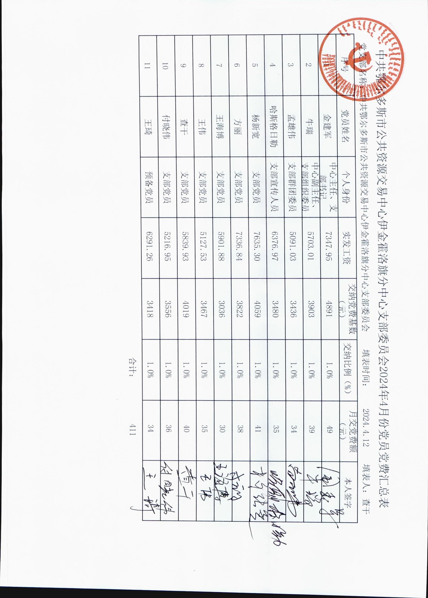 中共鄂尔多斯市公共资源交易中心伊金霍洛旗分中心支部委员会2024年4月党员党费收缴