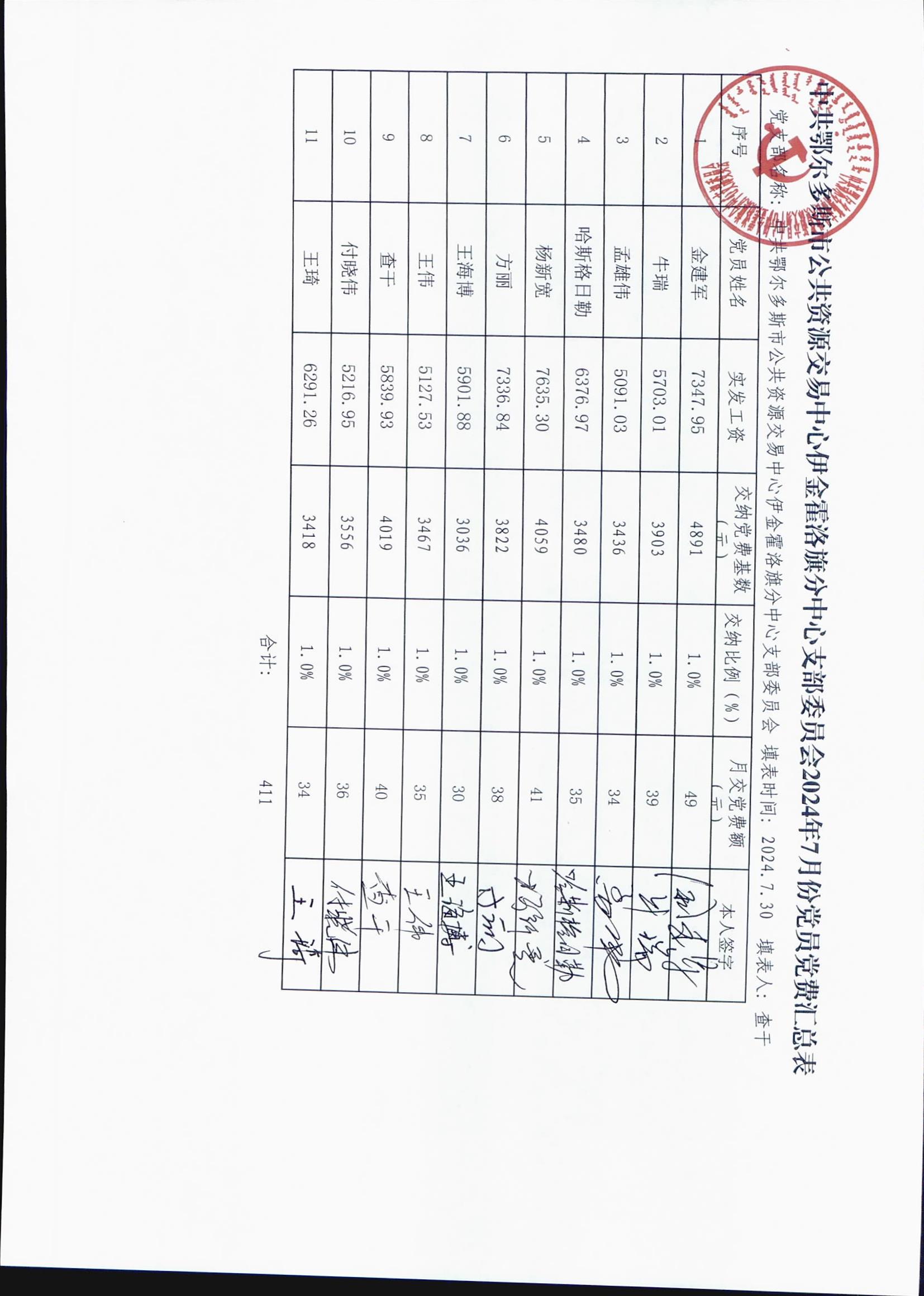 中共鄂尔多斯市公共资源交易中心伊金霍洛旗分中心支部委员会2024年7月党员党费收缴