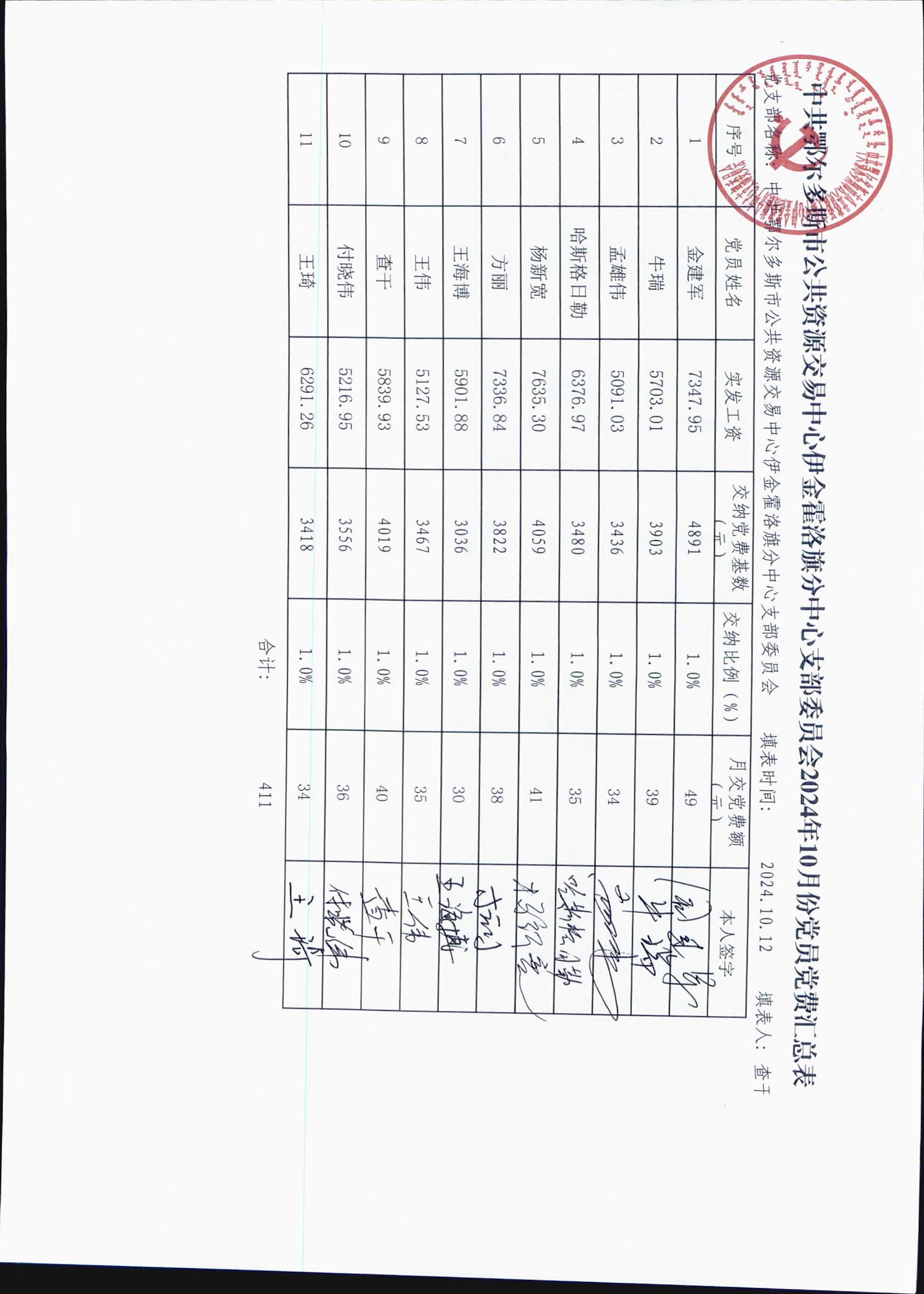 中共鄂尔多斯市公共资源交易中心伊金霍洛旗分中心支部委员会2024年10月党员费用收缴