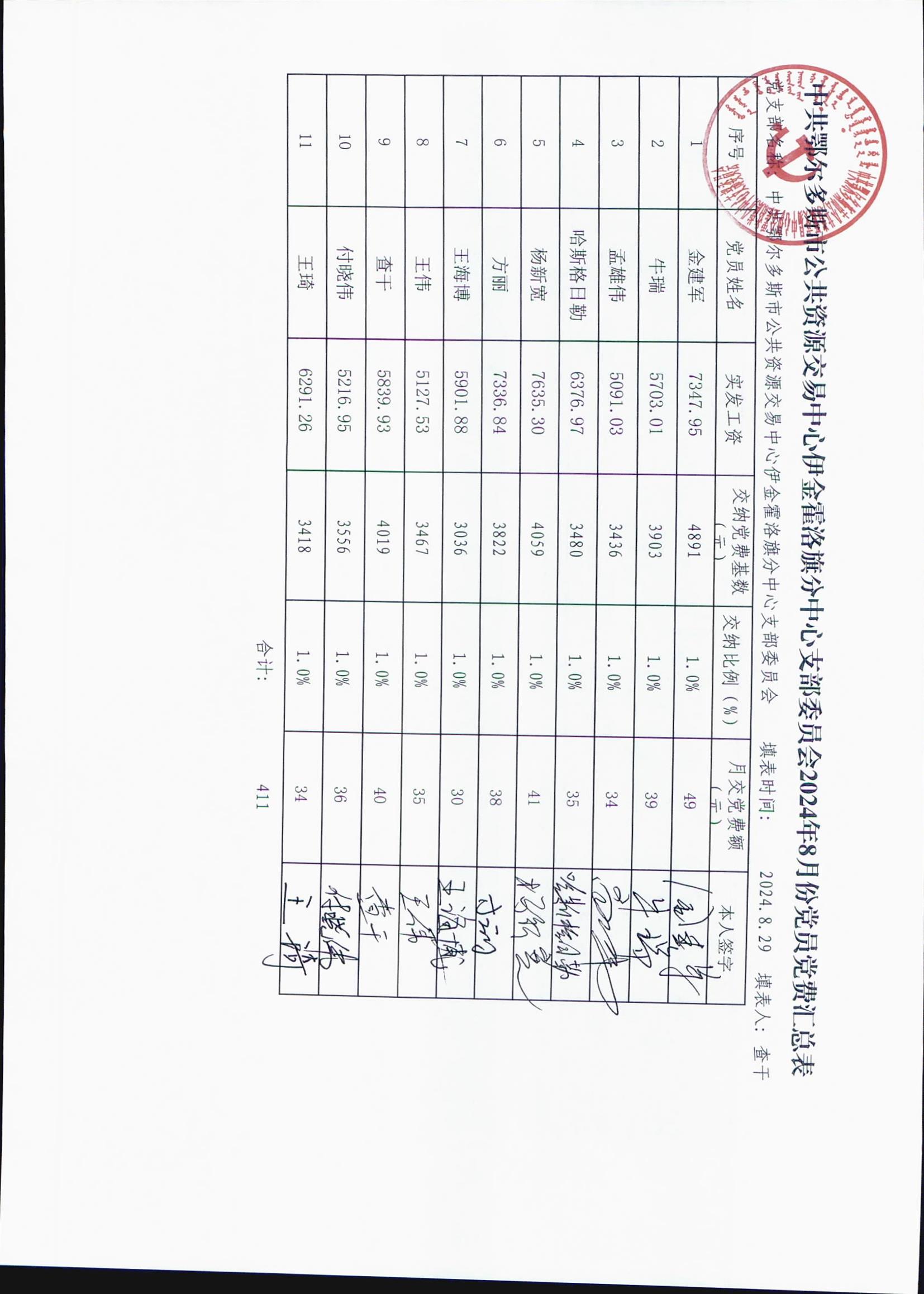 中共鄂尔多斯市公共资源交易中心伊金霍洛旗分中心支部委员会2024年8月党员费用收缴