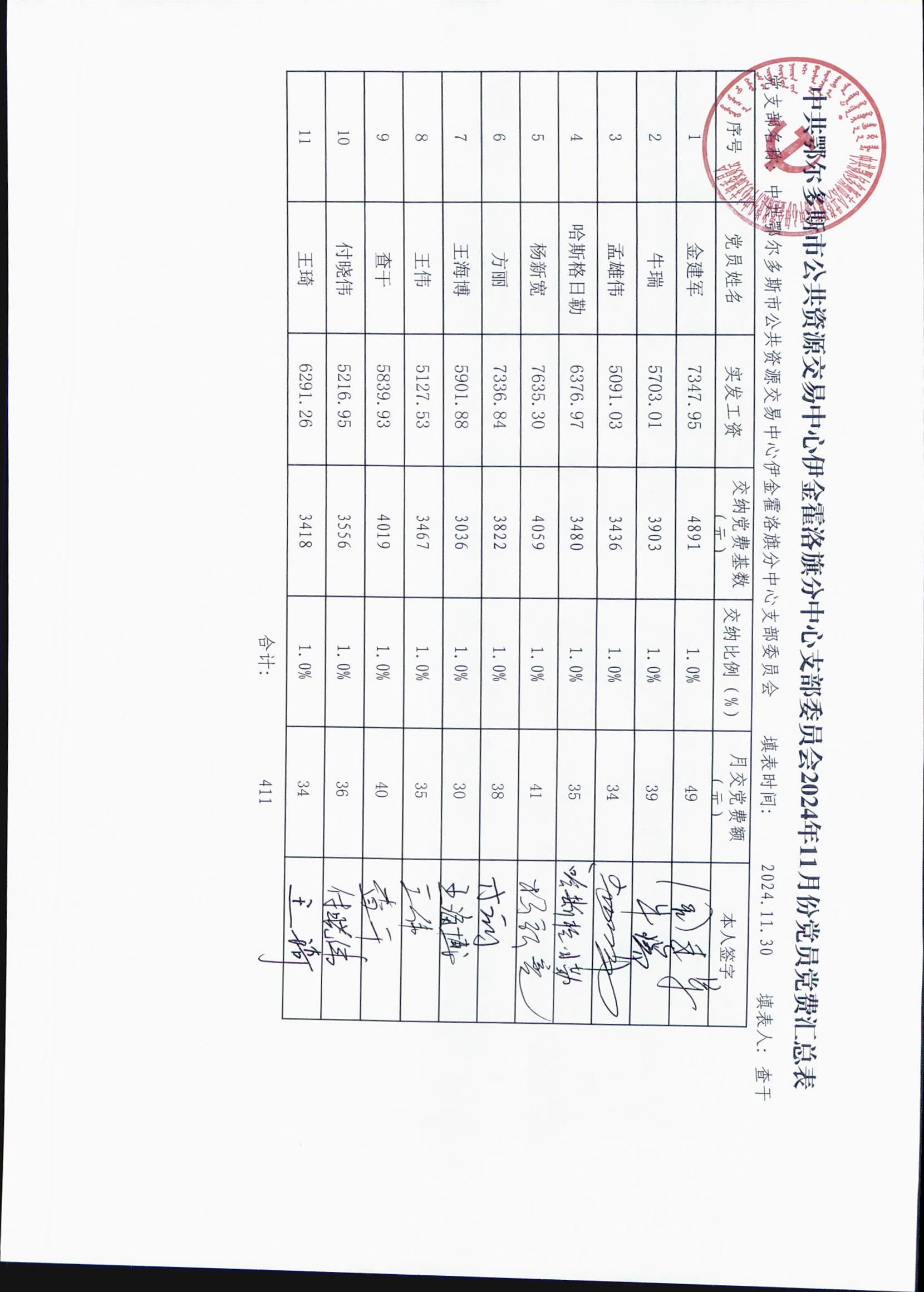 中共鄂尔多斯市公共资源交易中心伊金霍洛旗分中心支部委员会2024年11月党员费用收缴