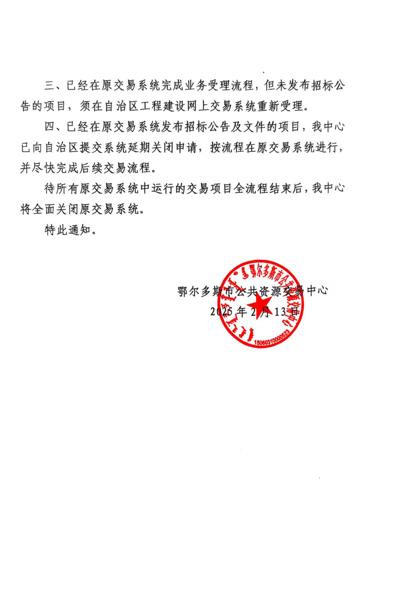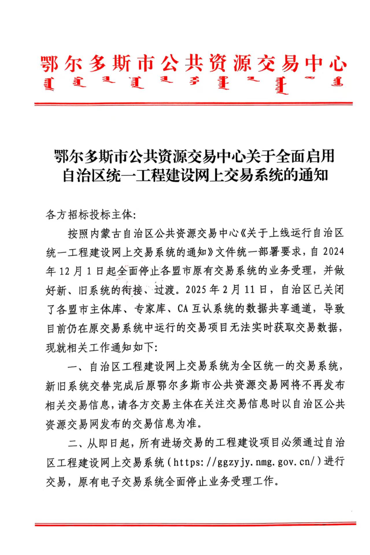 鄂尔多斯市公共资源交易中心关于全面启用自治区统一工程建设网上交易系统的通知