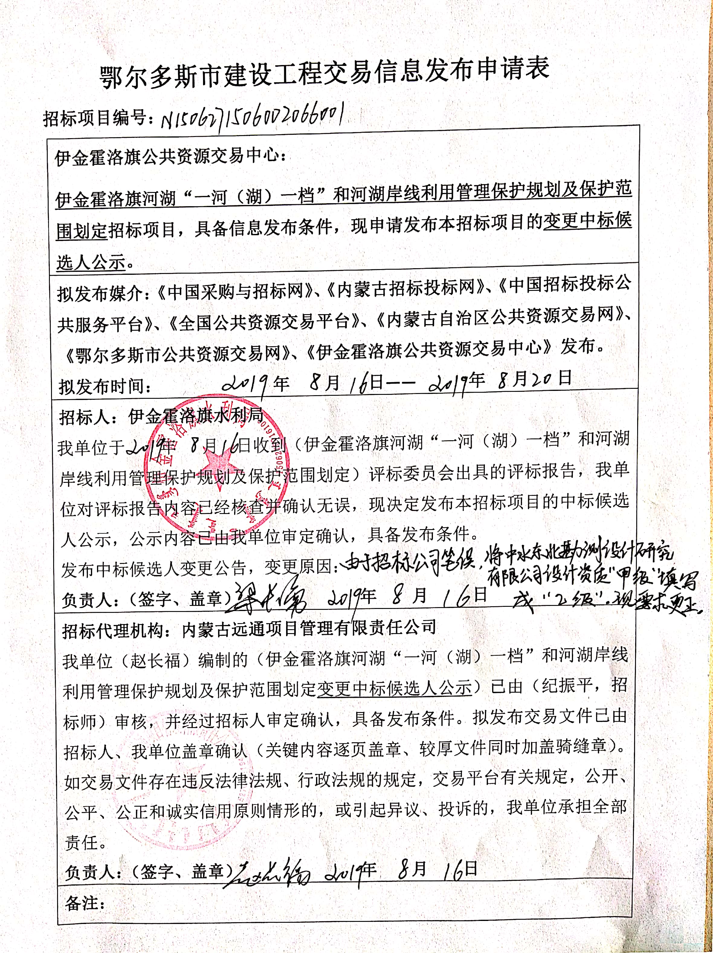 伊金霍洛旗河湖“一河(湖)一档”和河湖岸线利用管理保护规划及保护范围划定项目勘察设计标段中标候选人变更公示